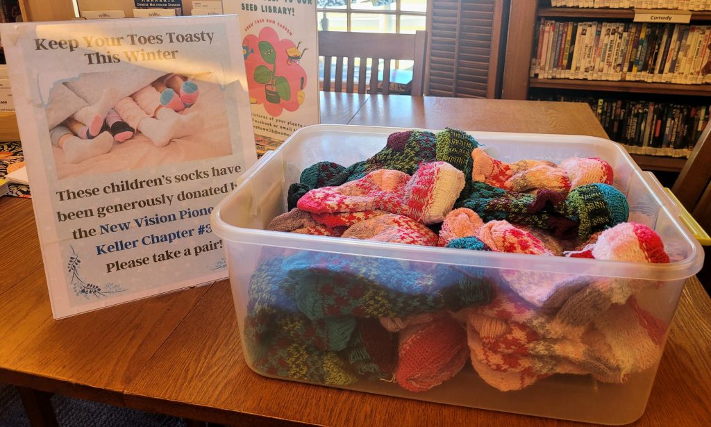 If you could use some warm and cozy children’s socks for the winter, please stop by the library to grab a pair! These were very generously donated to us by the New Vision Pioneers – Keller Chapter #33